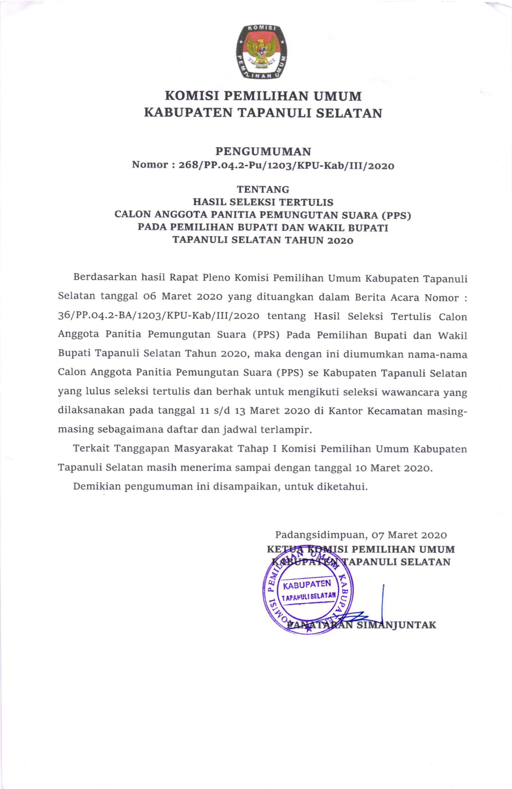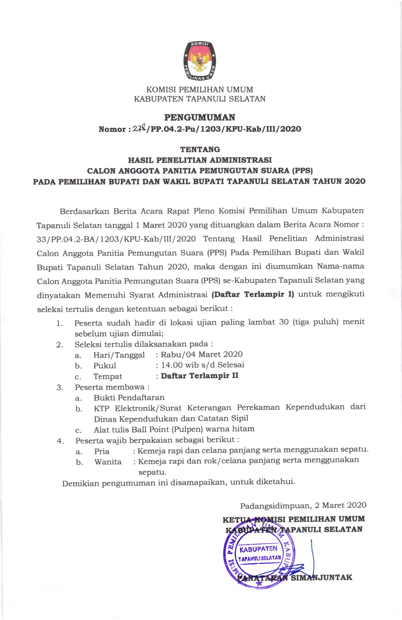 Pengumuman Hasil Seleksi Tertulis Calon Anggota Panitia Pemungutan Suara (PPS) Pada Pemilihan Bupati dan Wakil Bupati Tapanuli Selatan Tahun 2020