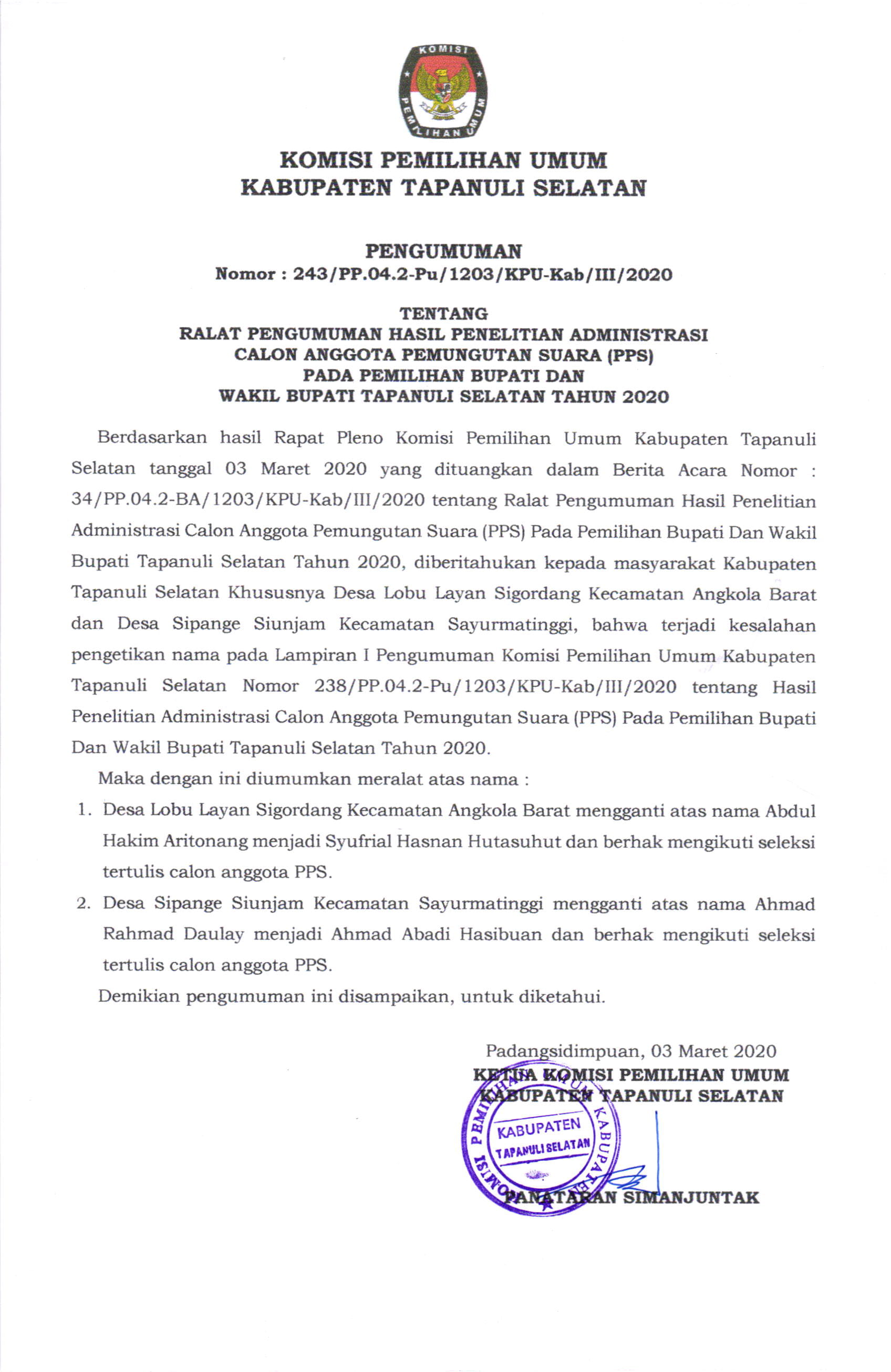 Ralat Pengumuman Hasil Penelitian Administrasi Calon Anggota Panitia Pemungutan Suara (PPS) Pada Pemilihan Bupati dan Wakil Bupati Tapanuli Selatan Tahun 2020